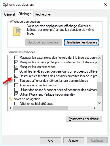 Pour retrouver tous les dossiers de l’Explorateur au prochain démarrage de l’ordinateur, ouvrez l’Explorateur de fichiers, basculez sur l’onglet Affichage, cliquez sur l’icône Options. La boîte de dialogue Options des dossiers s’affiche. Basculez sur l’onglet Affichage et cochez la case Restaurer les fenêtres des dossiers ouvertes lors de la prochaine session.