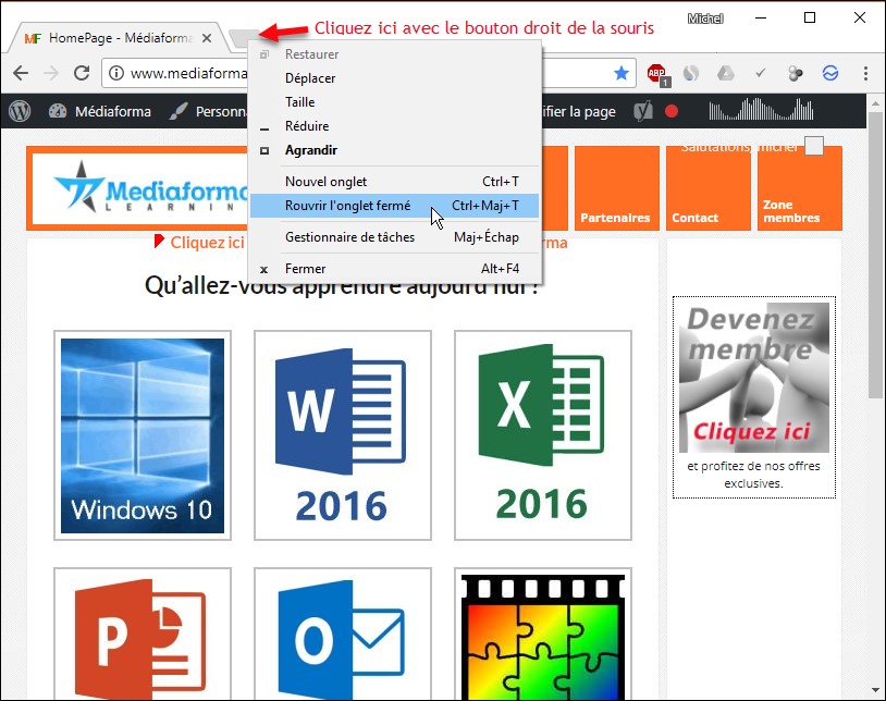 Cliquez du bouton droit sur Nouvel onglet et cliquez sur Rouvrir l’onglet fermé dans le menu. Vous préférez les raccourcis clavier ? Appuyez simultanément sur les touches Contrôle, Majuscule et T pour arriver au même résultat :