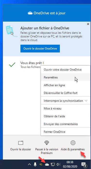 Cliquez sur l’icône de OneDrive dans la zone de notification, sur Aide et paramètres, puis sur Paramètres :