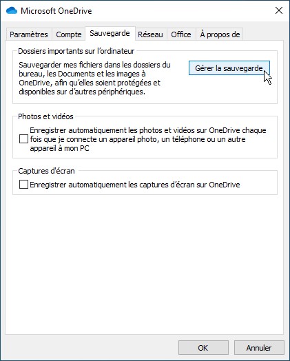 La boîte de dialogue Microsoft OneDrive s’affiche. Basculez sur l’onglet Sauvegarde et cliquez sur Gérer la sauvegarde :