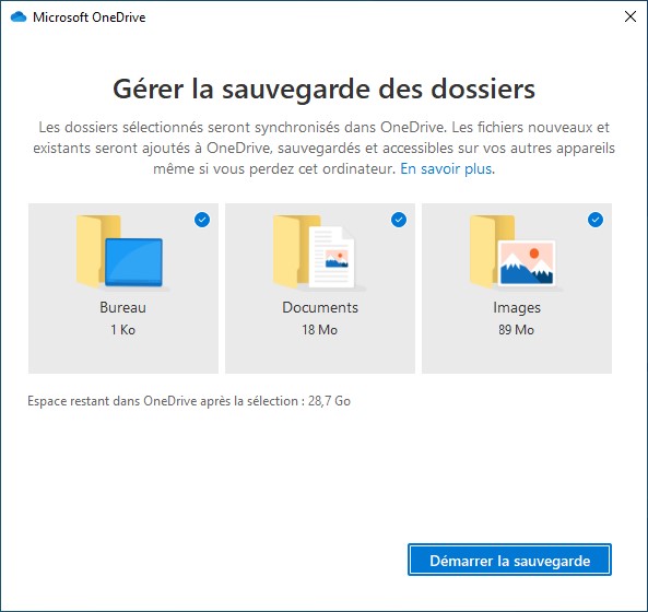 Cliquez enfin sur Démarrer la sauvegarde. À présent, les dossiers sélectionnés seront automatiquement sauvegardés sur votre espace OneDrive.