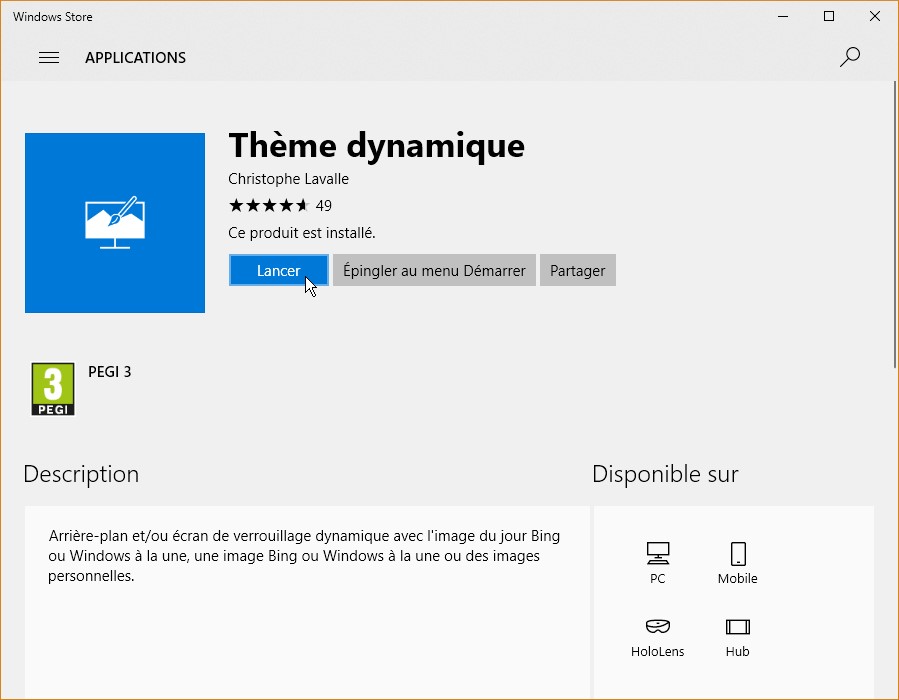 Cliquez sur Obtenir pour télécharger et installer l’application. Quelques instants plus tard, la fenêtre du Windows Store vous indique que l’application a été installée. Cliquez sur Lancer pour l’exécuter :