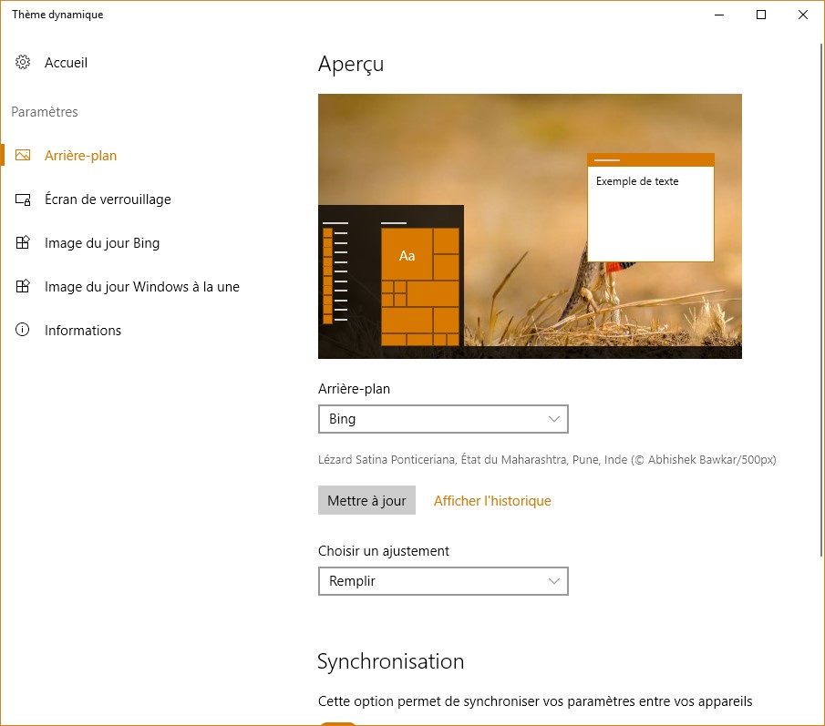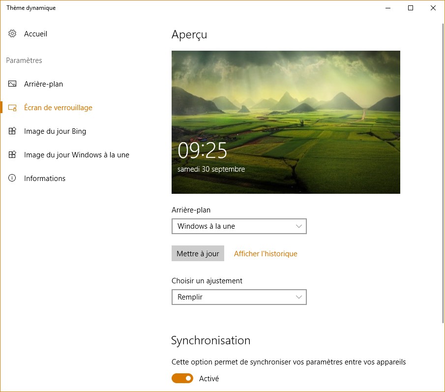 Pour affecter l’image du jour Bing ou Windows à la Une à l’écran de verrouillage, basculez sur l’onglet Ecran de verrouillage, faites votre choix dans la liste déroulante Arrière-plan et choisissez un mode d’affichage dans la liste déroulante Choisir un ajustement. Ici par exemple, l’image du jour Windows à la Une est affectée à l’arrière-plan de l’écran de verrouillage. Elle couvrira tout l’écran, quelle que soit sa résolution. Si vous placez l’interrupteur Synchronisation en position Activé, tous les appareils qui utilisent le même compte Windows partageront ce nouveau réglage :