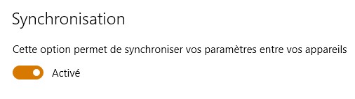 Dans la partie inférieure de la fenêtre, remarquez l’interrupteur Synchronisation. Si vous l’activez, tous vos ordinateurs, téléphones et tablettes qui utilisent le même compte utilisateur partageront ce réglage :