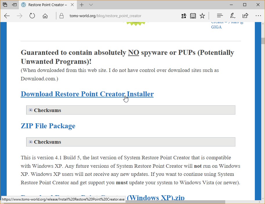 Rendez-vous sur la page https://www.toms-world.org/blog/restore_point_creator et cliquez sur le lien Download Restore Point Creator Installer :