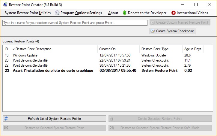 Lancez l’application. La liste des points de restauration apparaît dans la fenêtre :