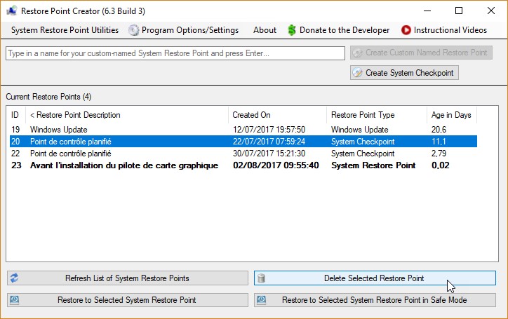 Pour supprimer un point de restauration, cliquez dessus dans la liste puis cliquez sur le bouton Delete Selected Restore Point :