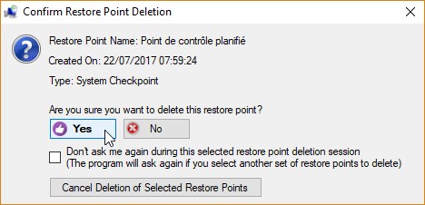 Une boîte de confirmation s’affiche. Cliquez sur Yes pour supprimer le point de restauration :