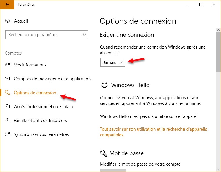Cliquez sur Démarrer puis sur l’icône Paramètres, en forme de roue dentée. La fenêtre Paramètres Windows s’affiche. Cliquez sur l’icône Comptes. Dans la fenêtre qui s’affiche, sélectionnez l’onglet Options de connexion. Sous Exiger une connexion, déroulez la liste et sélectionnez Jamais :