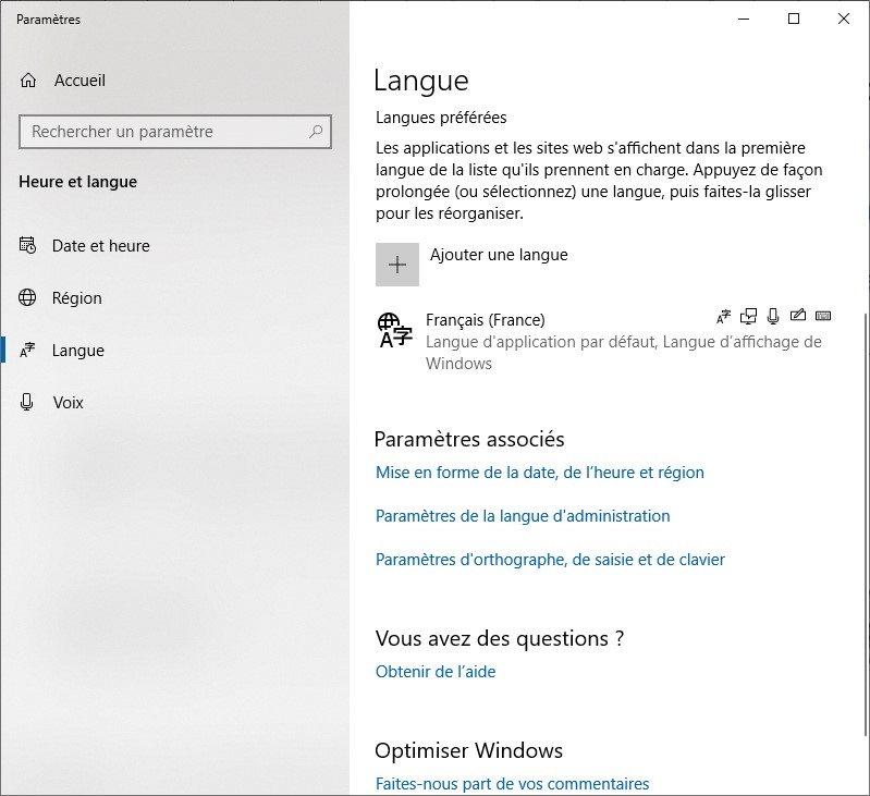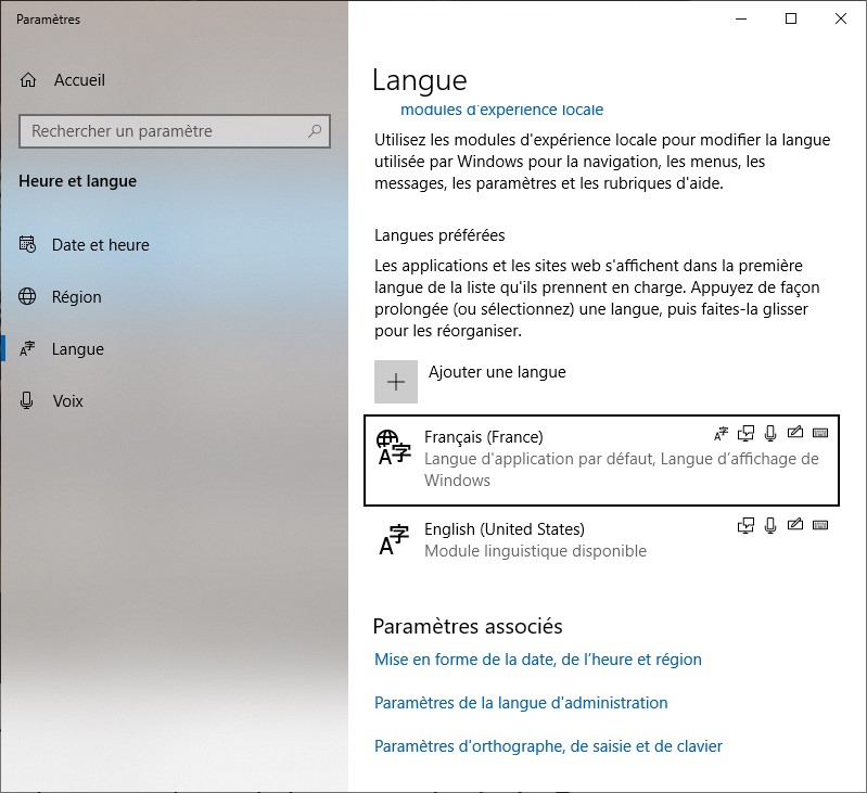 S’il ne l’est toujours pas, cliquez sur Démarrer, tapez langue et cliquez sur Modifier les paramètres de langue et de clavier dans la partie supérieure du menu Démarrer. La boîte de dialogue Heure et langue s’affiche. Normalement, une seule langue est présente :