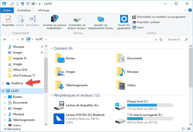 Dans Windows 10, votre espace OneDrive est directement accessible depuis le volet gauche de l’Explorateur de fichiers :