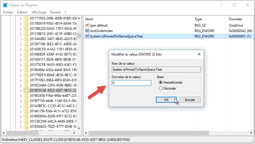 Cliquez sur Démarrer ou appuyez sur la touche Windows du clavier, tapez regedit et cliquez sur regedit dans la partie supérieure du menu Démarrer. Si le contrôle de compte d’utilisateur se manifeste, validez l’exécution du programme regedit en cliquant sur Oui. La fenêtre de l’éditeur du Registre s’affiche. Développez les entrées HKEY_CLASSES_ROOT, puis CLSID. Cliquez sur {018D5C66-4533-4307-9B53-224DE2ED1FE6}. Double-cliquez sur System.IsPinnedToNameSpaceTree dans le volet droit. Une boîte de dialogue intitulée Modifier la valeur DWORD 32 bits s’affiche. Tapez 0 dans la zone de texte Données de la valeur et cliquez sur OK.