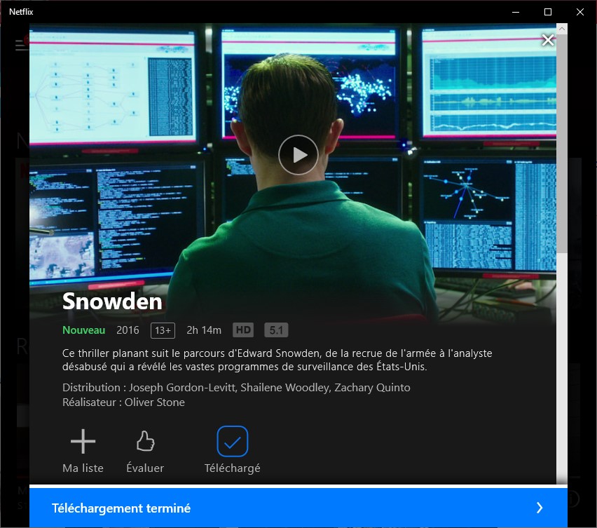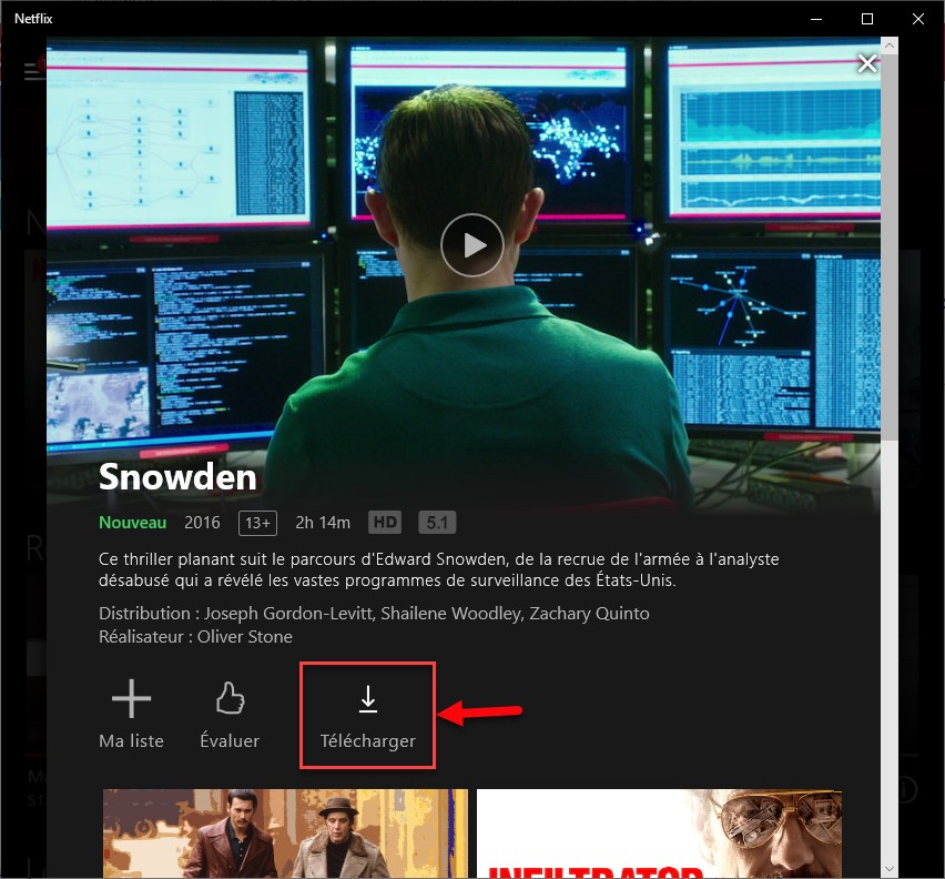 Cliquez sur le film ou la série que vous voulez télécharger. Si l’icône Télécharger est apparente, cela signifie que vous pouvez télécharger votre sélection pour un visionnage hors connexion (dans le cas contraire, la sélection n’est pas téléchargeable). Cliquez sur Télécharger :