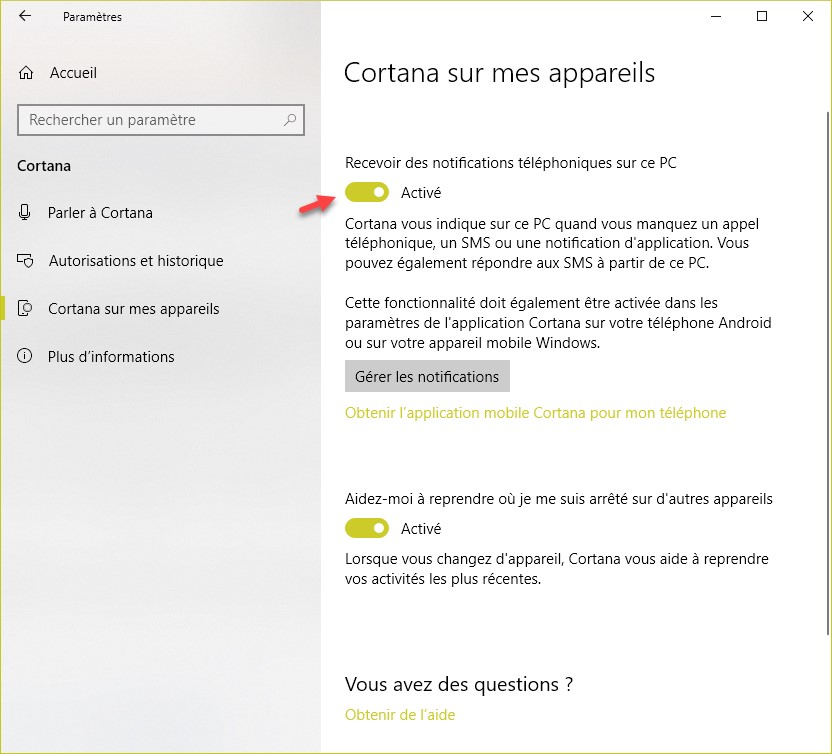 Pour cela, cliquez sur Démarrer puis sur Paramètres. Dans la fenêtre Paramètres Windows, cliquez sur Cortana. Une nouvelle fenêtre s’affiche. Basculez sur l’onglet Cortana sur mes appareils et activez l’interrupteur sous Recevoir des notifications téléphoniques sur ce PC :