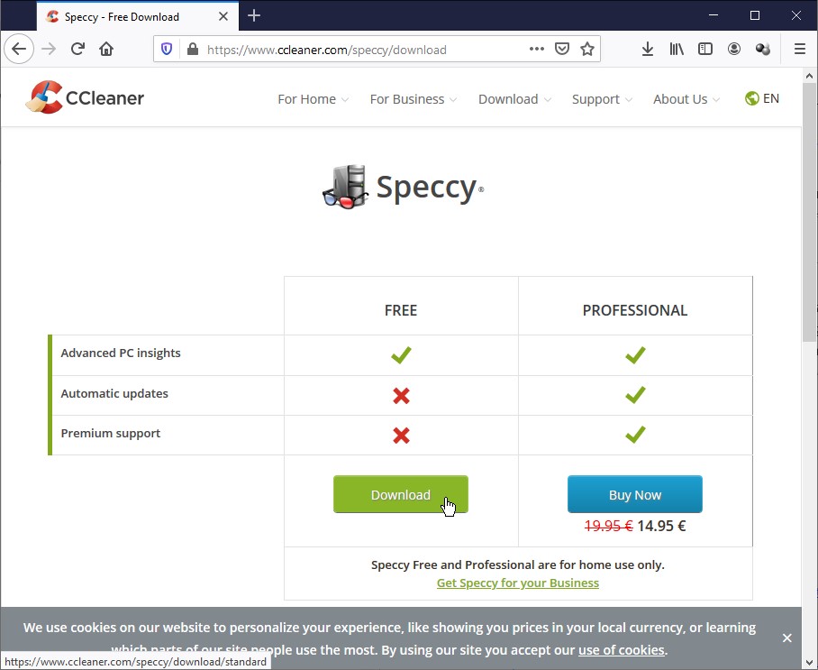 Rendez-vous sur la page http://www.piriform.com/speccy/download et cliquez sur le lien Download, sous FREE :