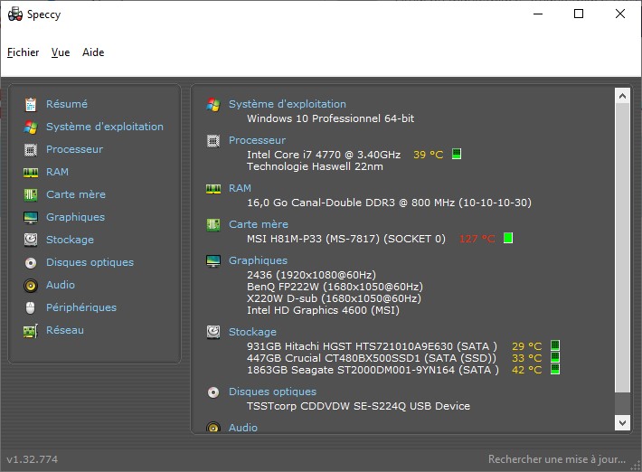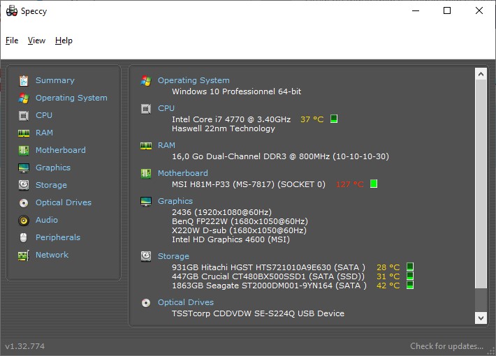 Par défaut, Speccy affiche le résumé de toutes les composantes matérielles. Pour en savoir plus sur l’une d’entre elles, cliquez sur l’élément correspondant dans le volet gauche.