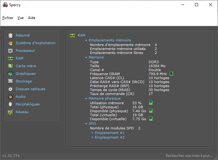 Par exemple, en cliquant sur RAM, vous savez exactement le type et la quantité de mémoire utilisé :