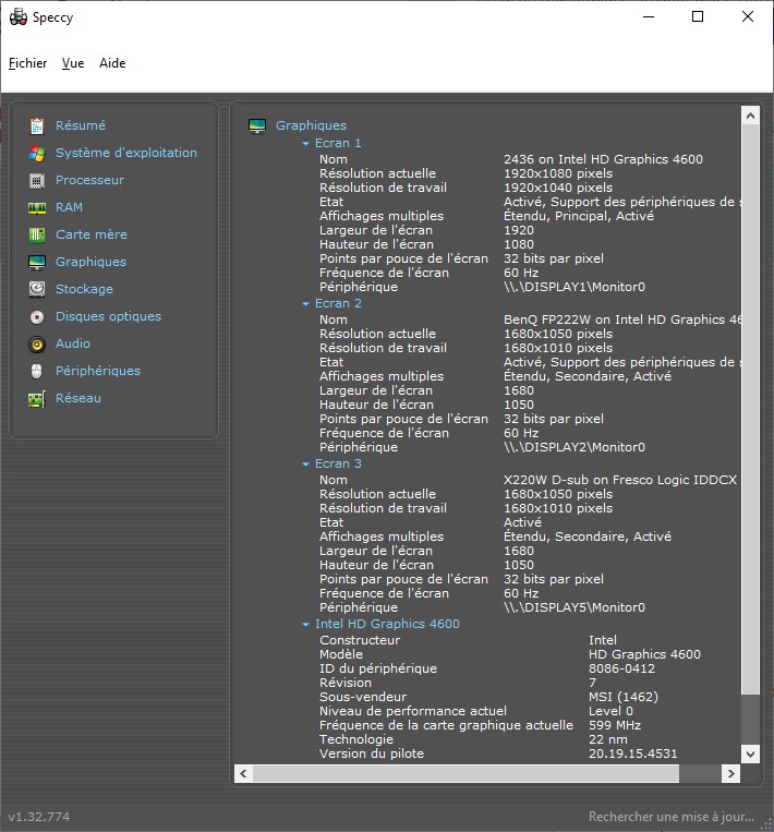 Un autre exemple, en cliquant sur Graphiques, on obtient la référence de la carte graphique, ainsi que celle des écrans qui y sont connectés :