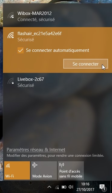 Cliquez sur le hotspot FlashAir, cochez la case Se connecter automatiquement et cliquez sur Se connecter :