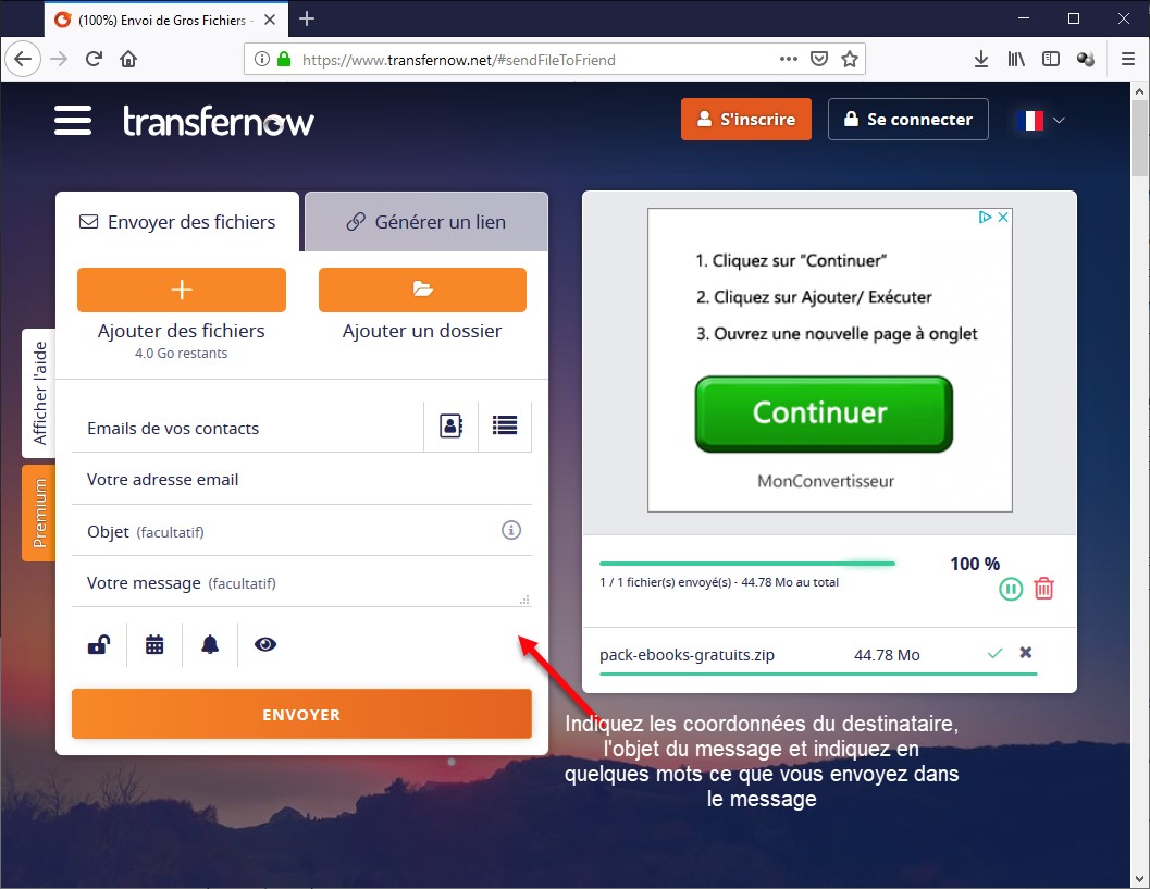 Sans abonnement, vous pouvez transférer des fichiers jusqu’à 4 Go par transfert. Glissez-déposez le ou les fichiers à transférer sur la page Web ou cliquez sur Démarrer pour les sélectionner sur vos unités de masse. Indiquez alors les coordonnées du destinataire, l’objet du message et tapez quelques mots pour lui dire ce que vous lui envoyez :