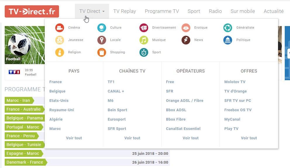 Dans la partie supérieure de la page, cliquez sur TV Direct pour accéder aux chaînes de TV par catégories, par pays, par fournisseur d’accès à Internet (FAI)