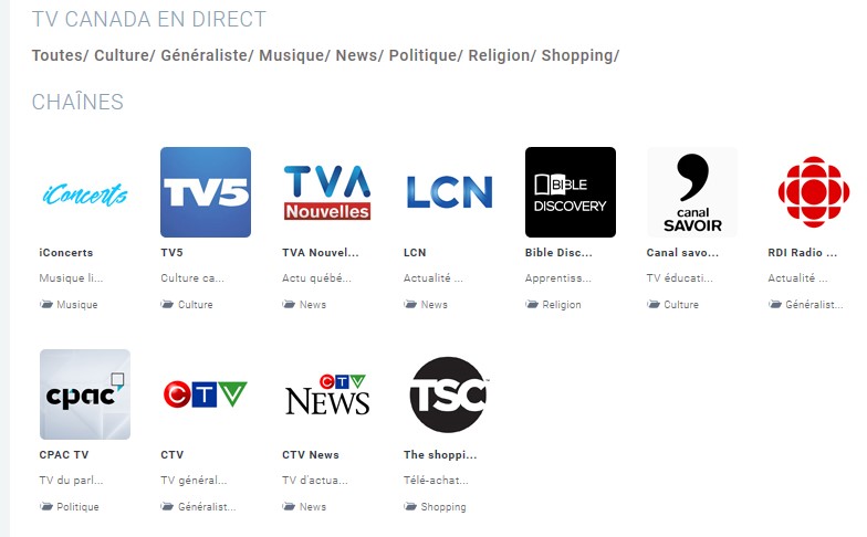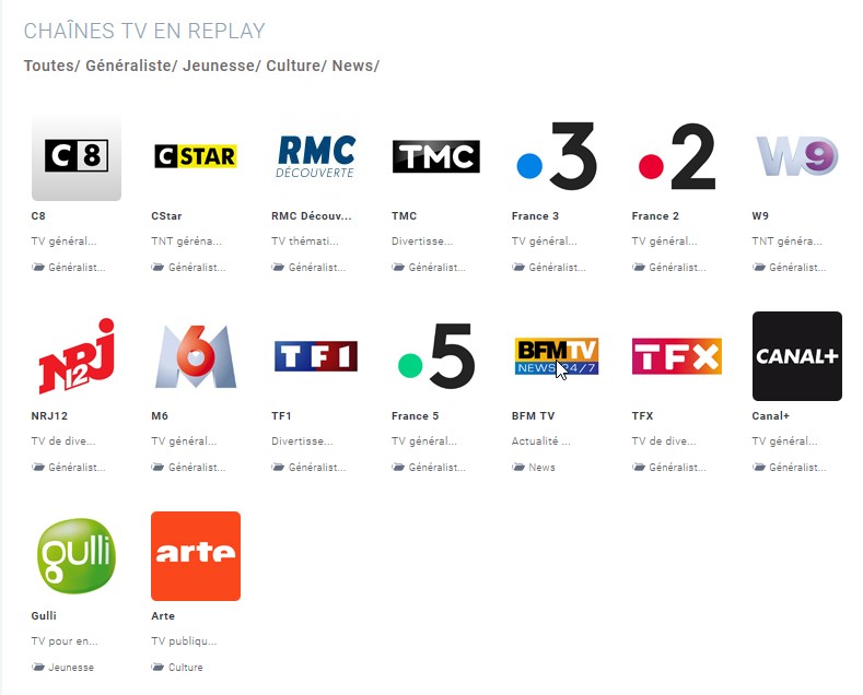 Cliquez sur la chaîne qui vous intéresse. Elle sera accessible directement via votre navigateur ou via une chaîne de la box TV de votre fournisseur d’accès à Internet.