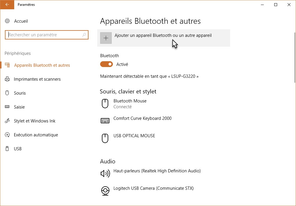 Pour activer cette fonctionnalité, cliquez sur le bouton Démarrer ou appuyez sur la touche Windows du clavier puis cliquez sur l’icône Paramètres en forme de roue dentée. La boîte de dialogue Paramètres Windows s’affiche. Cliquez sur l’icône Périphériques. Dans la nouvelle boîte de dialogue, cliquez sur Ajouter un appareil Bluetooth ou un autre appareil :
