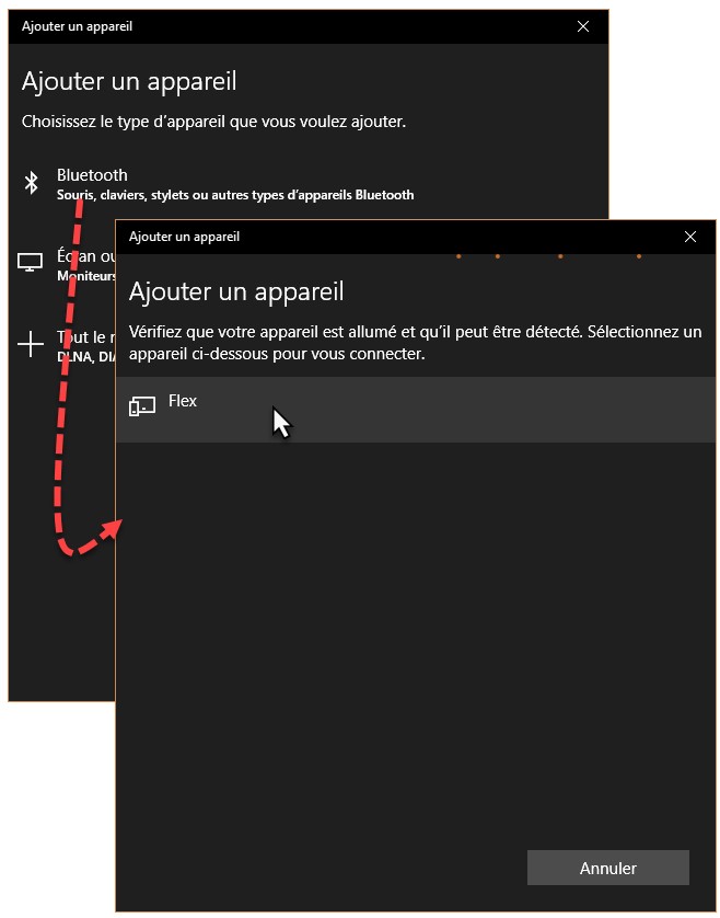 La boîte de dialogue Ajouter un appareil s’affiche. Cliquez sur Bluetooth. Quelques instants plus tard, les appareils qui peuvent communiquer en Bluetooth avec votre ordinateur apparaissent dans la boîte de dialogue. Ici, un bracelet Flex a été identifié. Cliquez dessus pour le coupler à l’ordinateur :