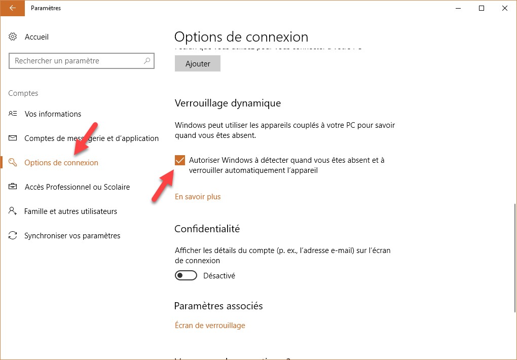 Lorsque le périphérique Bluetooth est couplé, cliquez sur Démarrer ou appuyez sur la touche Windows du clavier, puis cliquez sur l’icône Paramètres. Dans la boîte de dialogue Paramètres Windows, cliquez sur l’icône Comptes. Une nouvelle boîte de dialogue s’affiche. Sélectionnez Options de connexion dans le volet gauche puis déplacez le volet droit pour atteindre la section Verrouillage dynamique. Cochez la case Autoriser Windows à détecter quand vous êtes absent et à verrouiller automatiquement l’appareil :