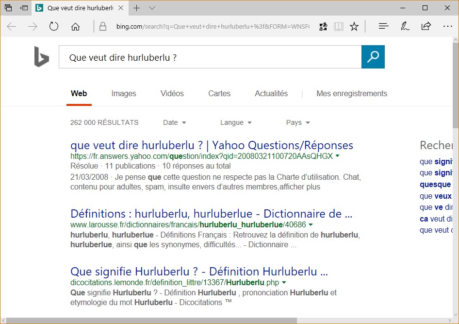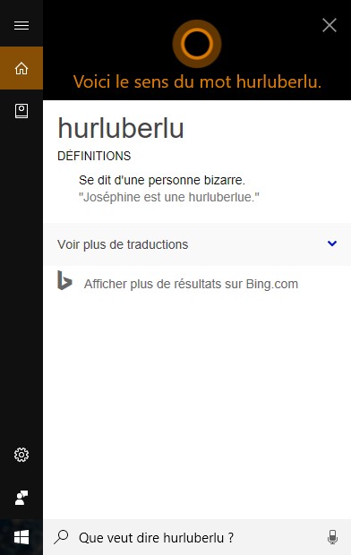 Pourquoi se fatiguer à taper quelque chose au clavier ? Dites simplement « Que veut dire » suivi du mot dont vous voulez la définition. Vous aurez une réponse vocale et dans le menu Démarrer :