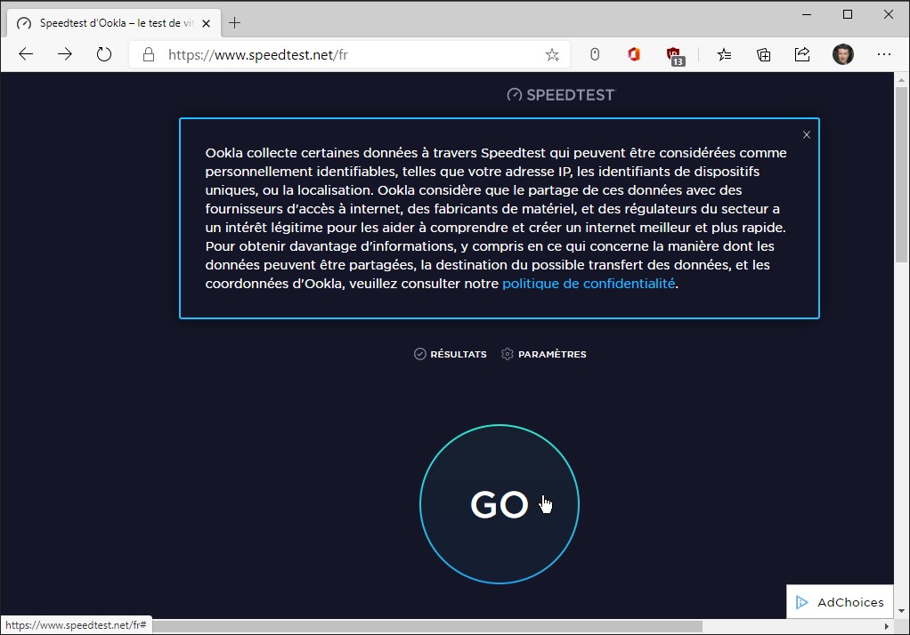 Vous avez une box Internet fibre et vous avez l’impression que les émissions et réceptions de données sur votre ordinateur sont trop lentes ? Dans un premier temps, vous pouvez tester la vitesse réelle de votre connexion en vous rendant sur la page https://www.speedtest.net/fr et en cliquant sur GO :