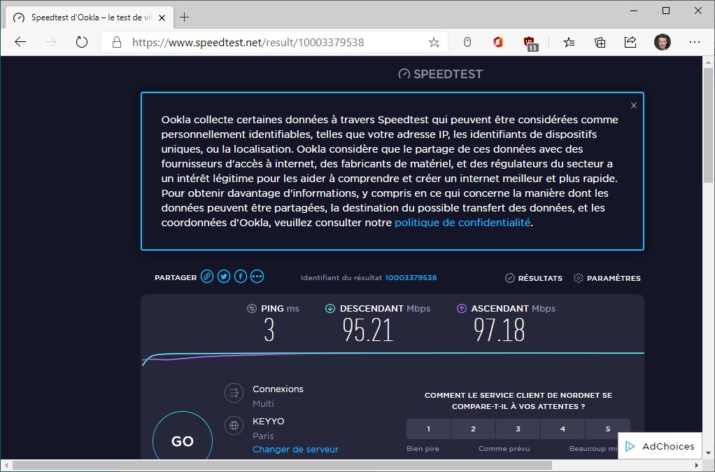 Quelques instants plus tard, vous connaîtrez le ping et les débits descendant et montant :