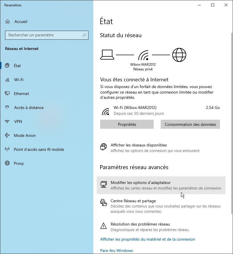 Cliquez du bouton droit sur l’icône Réseau dans la zone de notification et sélectionnez Ouvrir les paramètres réseau et Internet dans le menu contextuel. La fenêtre État s’affiche. Sous Paramètres réseau avancés, cliquez sur Modifiez les options d’adaptateur :