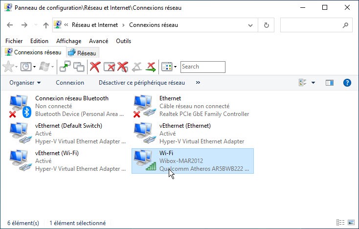 La boîte de dialogue Connexions réseau s’affiche. Double-cliquez sur votre adaptateur réseau. Ici, une carte Wi-Fi Qualcom Atheros :