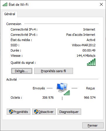 Une nouvelle boîte de dialogue s’affiche. La vitesse de connexion s’affiche en face du libellé Vitesse. Ici, 144,4 Mbits/s. Dans notre cas, la vitesse de connexion de l’adaptateur réseau est supérieure à celle de la box (100 Mbits/s). Ce n’est donc pas l’adaptateur réseau qui freine la connexion :