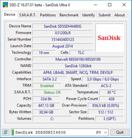 Après quelques instants, la fenêtre de SSD-Z s’affiche. Si nécessaire, sélectionnez votre SSD dans la liste déroulante inférieure pour afficher ses caractéristiques :