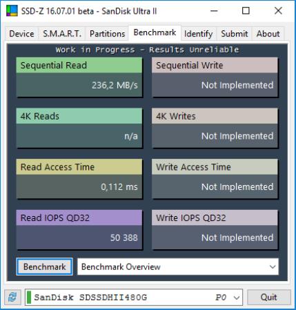 Dans cet exemple, le SSD est un SanDisk de 500Go. Pour connaitre la vitesse d’accès à ce SSD, basculez sur l’onglet Benchmark et cliquez sur Benchmark. Au bout de quelques secondes, une ou plusieurs informations sont reportées dans la fenêtre.