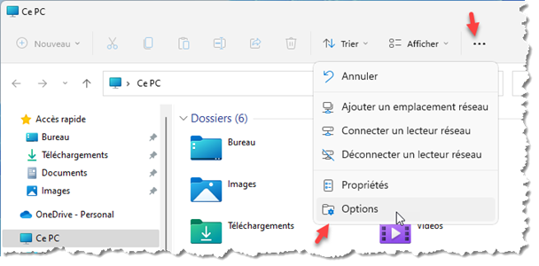 Si les images ne sont plus représentées par des miniatures lorsque vous sélectionnez un affichage Très grandes icônes, Grandes icônes ou Icônes moyennes dans l’Explorateur de fichiers, cliquez sur l’icône qui représente des points de suspension, puis sur Options :