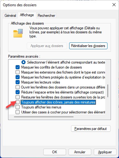 La boîte de dialogue Options des dossiers s’affiche. Basculez sur l’onglet Affichage. Décochez la case Toujours afficher des icônes, jamais des miniatures et validez le nouveau réglage en cliquant sur OK :