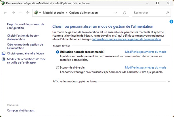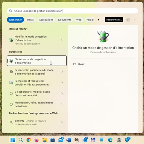 Cliquez sur Démarrer, tapez alimentation et cliquez sur Choisir un mode de gestion d’alimentation dans la partie supérieure du menu Démarrer :