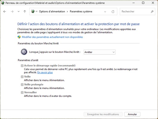 Dans le volet gauche, cliquez sur Choisir l’action du bouton d’alimentation. La boîte de dialogue Paramètres système s’affiche :