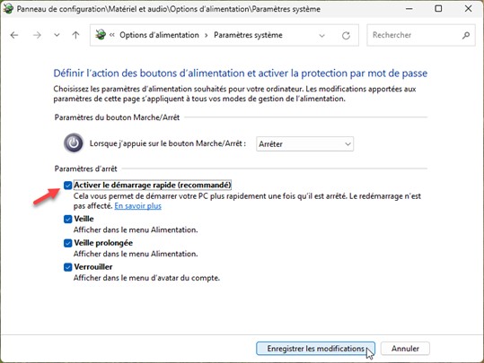 Cochez la case Activer le démarrage rapide et validez en cliquant sur Enregistrer les modifications.