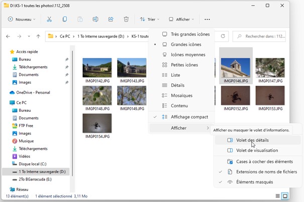 Ouvrez l’explorateur de fichiers et rendez-vous dans le dossier qui contient vos photos. Dans la barre d’outils, cliquez sur Afficher, pointez Afficher et cliquez sur Volet des détails :