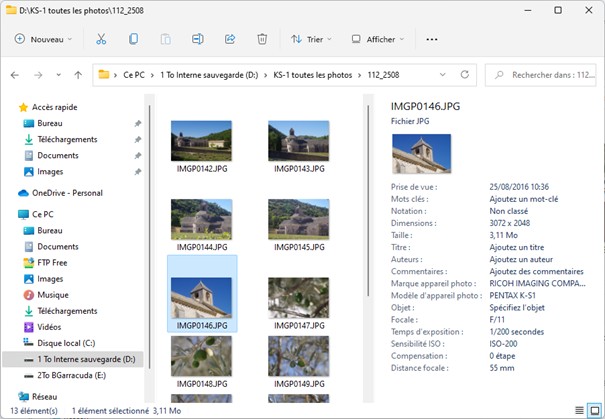 Il vous suffit maintenant de cliquer sur une photo pour afficher les métadonnées qui lui sont associées dans le volet droit de l’explorateur de fichiers.