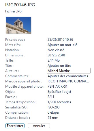 Si nécessaire, vous pouvez ajouter des métadonnées. Il suffit pour cela de cliquer sur les zones correspondantes dans le volet droit et d’utiliser le clavier. Vous pourriez par exemple ajouter un auteur, des mots-clés, un titre et des commentaires à la photo :
