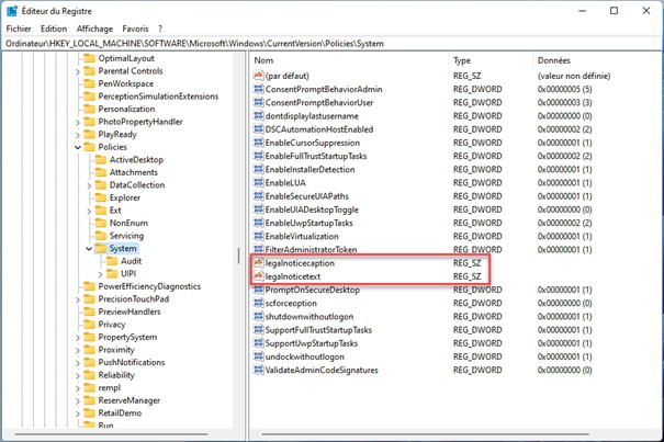 Dans le volet droit de la fenêtre de l’éditeur du registre, vous allez modifier les chaînes legalnoticecaption et legalnoticetext :