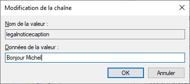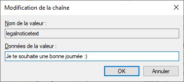 La valeur legalnoticecaption correspond au titre du message et la chaine legalnoticetext au texte du message. Double-cliquez sur l’une puis sur l’autre et définissez le titre et le texte du message que vous voulez afficher :