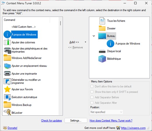 Pour ajouter une entrée dans un des menus contextuels, sélectionnez une commande dans la zone de liste de gauche, un élément dans la zone de liste de droite, cliquez sur Add>>, puis sur Add to selected item. Ici par exemple, la commande À propos de Windows est ajoutée dans le menu contextuel qui s’affiche lorsque vous cliquez du bouton droit sur le bureau de Windows :