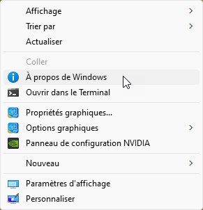 Cliquez du bouton droit sur le bureau, puis sur Afficher d’autres options. Comme vous pouvez le voir, l’entrée À propos de Windows a été ajoutée dans le menu contextuel :
