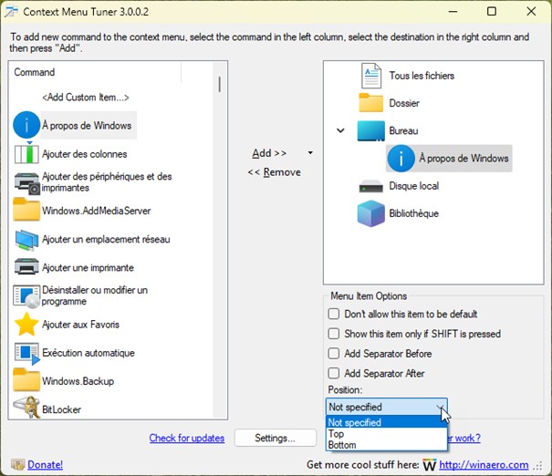 Si nécessaire, vous pouvez afficher cette commande en première ou en dernière position dans le menu contextuel. Cliquez sur la commande dans la deuxième zone de liste (1) et agissez sur la liste déroulante Position (2):